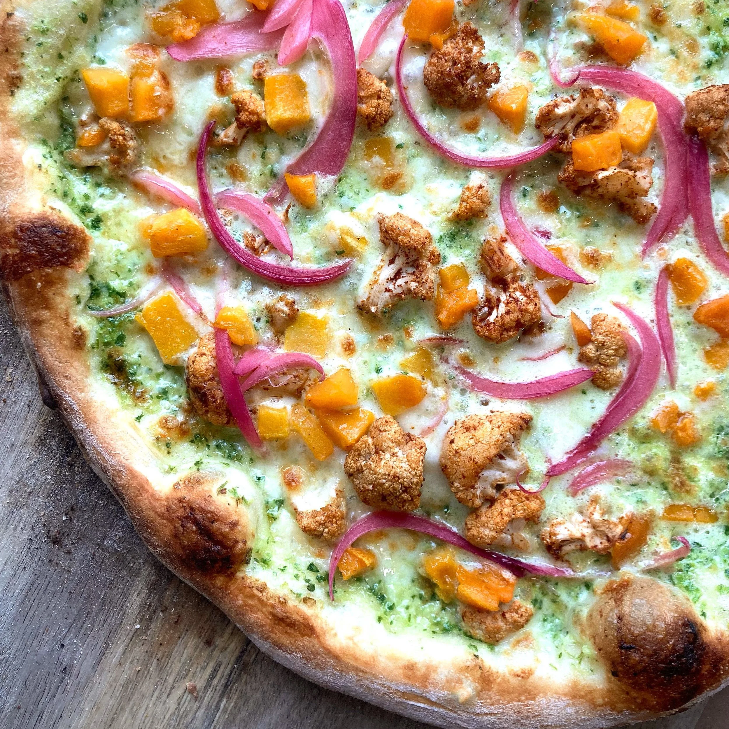 SPICY CAULIFLOWER, BUTTERNUT SQUASH & PICKLED RED ONION: Spicy smoked cauliflower, butternut squash, house pickled red onion, garlic and herb cream sauce, mozzarella and provolone